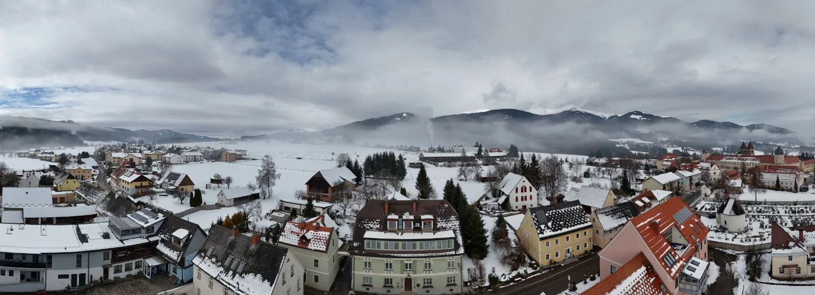 Eine verschneite Straße in einem europäischen Dorf, umgeben von bunten Häusern mit Schnee bedeckten Dächern und einem Berg im Hintergrund.